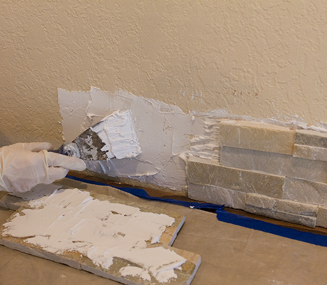 We used the same Type 1 mastic we had used for the backsplash tile (the guy at Lowe's said it would be fine). We just made sure to use a lot more to get into all of the grooves and hold it (these tiles are heavy!) and we buttered the backs of each piece.